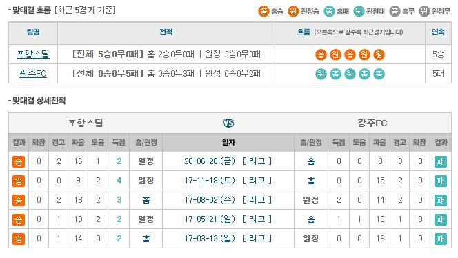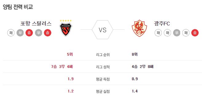 포항은 현재 리그 5위에 위치해 있습니다. 올 시즌 7승 3무 4패로 무난한 경기력을 보이고 있고 이전 경기에서 전북을 상대로 팔라시오스의 퇴장으로 2:1 패배를 기록하며 2경기 무승을 이어가고 있습니다. 전 경기에서 패배를 기록하면서 선두권과 거리가 멀어진 것은 물론 남은 일정에서도 적지 않은 타격을 받게 될 것으로 보입니다. 원정 무패의 기록도 깨짐과 동시에 핵심 공격 자원이었던 팔라시오스의 퇴장으로 출전 정지와 김완규, 이승모의 부상까지 겹치는 악재를 보였기 때문에 부상자와 공백을 보이고 있는 자리에 대책을 만들어내야 할 것으로 판단됩니다. 다만 상대의 측면 공격이 상당히 활발한 모습을 보이고 있기 때문에 부상자의 공백을 매우지 못한다면 이번 경기에서 포항은 근소한 차이로 패배를 기록할 것으로 예상이 됩니다.