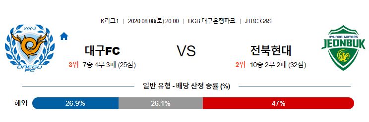 대구는 현재 리그 3위에 위치해 있습니다. 올 시즌 7승 4무 3패를 기록하며 상승세인 분위기를 보이고 있고 이전 경기에서 1명의 퇴장으로 숫적열세로 싸웠지만 수원을 상대로 1:0 승리로 2연승을 기록하고 있습니다. 대구는 이번 경기에서 K리그 통산 200승에 도전하며 승리를 가져와야지만 2위 추격의 발판을 마련할 수 있는 상황입니다. 단단하고 안정감 있는 수비로 팔공산성으로 불리는 정태욱, 김우석, 조진우의 수비라인이 실점을 최소화하며 이전 두 경기를 무실점으로 승리를 이끌었습니다. 또한 에드가 역시 36일 만에 복귀임에도 지난 경기 결승골로 제 기량을 찾아가고 있기 때문에 현재의 분위기를 유지하는 것이 가장 중요할 것입니다. 이전 경기에서 퇴장을 당한 김선민의 부재로 중원의 전력이 다소 감소할 것으로 보이며 상대의 강한 공격력을 막아내기란 힘겨워 보일 것입니다. 중원에서의 공백을 대체할 수 있는 방안을 만들어 내지 못한다면 대구는 이번 경기에서 패배를 피하기 어려울 것입니다.