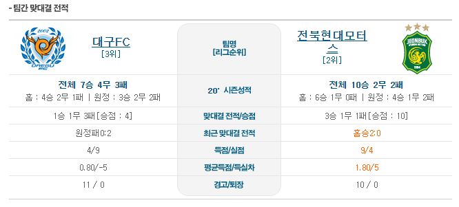 전북은 현재 리그 2위에 위치해 있습니다. 올 시즌 10승 2무 2패로 상당히 좋은 경기력을 보이고 있고 이전 포항을 상대로 2:1로 승리를 가져오면서 4경기 무패를 이어가고 있습니다. 구스타보와 바로우 두 외국인 선수를 영입하면서 효과를 톡톡히 보고 있습니다. 또한 측면의 한교원의 빠른 돌파와 크로스가 활발한 모습을 보였고 상대의 빠른 역습에도 안정감 있는 수비를 보이며 구스타보는 엄청난 피지컬로 상대 수비 진영을 흔들었고 이승기와 김보경까지 완벽한 패스 플레이를 보이고 있는 만큼 현재의 경기력을 그대로 유지하는 것이 가장 중요할 것으로 판단되는 상황입니다. 대구와 이전 맞대결에서 승리를 가져왔지만 대구 역시 상승세를 보이고 있는 만큼 방심해서는 안됩니다. 하지만 상대의 수비 전력을 흔들 수 있는 자원이 충분히 위협적인 모습을 보이고 있기 때문에 이번 경기에서 전북은 승리를 가져올 가능성이 높게 예상됩니다.