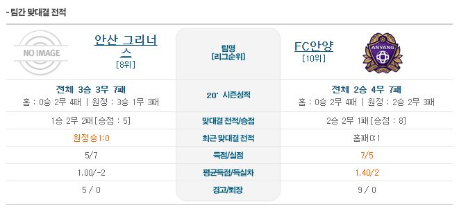 안양은 현재 리그 10위에 위치해 있습니다. 올 시즌 2승 4무 7패를 기록하며 하락세를 벗지 못하고 있고 이전 경기에서 경남을 상대로 1:0 패배를 하며 2연패를 기록 했습니다. 3백의 수비 라인의 불안정함은 개선되지 못하고 있고 마우리데스와 황문기, 권용현의 공격 라인은 좀처럼 득점 기회에서의 찬스를 살려내지 못하고 있는 상황입니다. 상대와 경기력에서의 큰 차이를 보이지 않고 있으며 오히려 득점력은 더 좋은 모습을 보이고 있습니다. 상대의 수비 역시 안정적이지 못한 상황이기 때문에 앞선 공격력을 이용해 상대의 수비벽을 허물어 득점 찬스를 살려낸다면 안양은 승리를 가져 오면서 순위와 분위기를 바꿀 수 있는 발판을 만들어 낼 수 있을 것으로 예상됩니다.