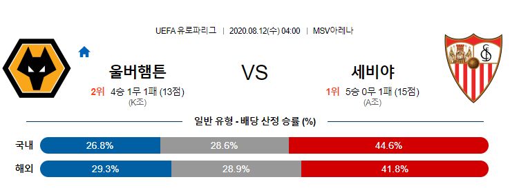 울버햄튼은 시즌 막판 공격작업에 꽤 어려움을 겪으며 자주 패배를 허용했다는 점을 감안하면, 이번 유로파리그 최대 이변의 희생양이 될 가능성도 충분히 존재합니다. 세비야는 재개 이후 12경기에서 7승 5무 0패로, 패배를 허용치않았지만 상대와 격차를 벌리는 힘은 부족한 편입니다. 두 팀 모두 주도권을 쥐는 능력은 뛰어나지만, 이를 득점으로 연결시키는 마무리능력은 부족한 편입니다. 세비야가 홈에서 워낙 강하기 때문에 울버햄튼도 이번 홈경기에서 승리하기 위해 애쓰겠지만, 세비야가 충분히 버텨낼 수 있을 것입니다. 다소 지루한 경기로 이어질 가능성이 높아보입니다.