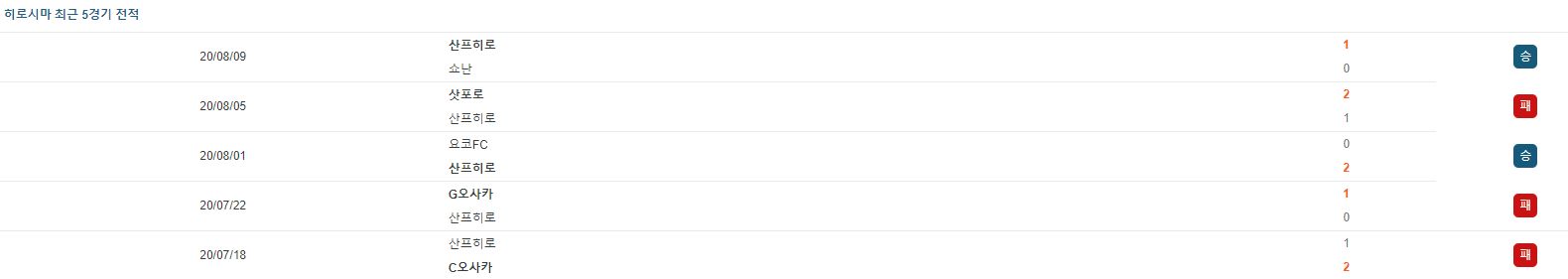 산프레체 히로시마는 전력이 조금 약해졌지만 산프레체 특유의 조직력과 압박을 통한 빠른 역습은 건재합니다. 하지만 핵심 윙어 가시와 요시후미가 부상당한 이후에는 공격전개속도가 현져히 느려졌고, 완성도까지 떨어지며 최근 6경기 2승 1무 3패에 그치고 있습니다. 산프레체의 최근 경기력이 좋지않고, 특히 후반에 집중력 저하로 인해 역전을 허용하거나 전력이 약한 팀을 상대로 골을 넣지 못하는 약점을 보이기도 했습니다. 사간도스는 1라운드에서 가와사키를 상대로 일방적인 경기를 허용했지만 간신히 실점을 막아내며 무승부를 기록했습니다. 하지만 재개 이후 4경기에서 득점에 실패하며 오이타, 빗셀고베 등에 무기력한 패배를 당했습니다. 다행이도 최근 3경기에서는 점차 득점력이 살아나기 시작했고, 직전 도쿄원정에서는 세 골을 넣으며 마침내 첫 승을 거뒀습니다. 두 팀 모두 컵대회에서 백업 선수들의 활용이 많은 편으로, 1군 경기력이 크게 반영되지는 않을 것입니다. 다만, 사간도스는 앞선 컵대회 2경기에서도 단 한 골도 넣지 못하며 무기력한 패배를 당했기 때문에 이번 경기에서도 큰 기대를 하기 어려운 상황입니다. 산프레체가 사간도스에 비해 앞도적인 경기력을 보여주는 팀이라 보긴 어렵지만, 공격력이 무딘 사간도스를 상대로는 홈에서 충분히 강점을 활용할 수 있을 것으로 보입니다.