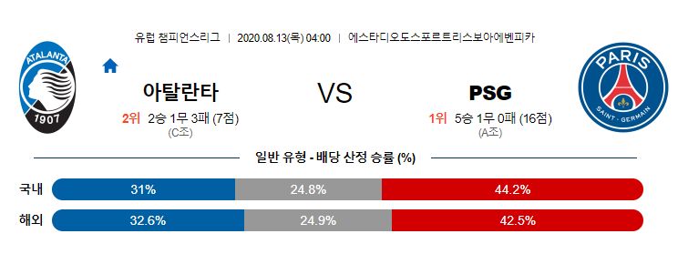 아탈란타는 지난 시즌 세리아A 3위로, 화끈한 공격력 흔히 닥공을 통해 마침내 챔스 무대에 입성하게 됐습니다. 케이시와 크리스탄테 등 미드필더 자원들이 팀을 떠나긴 했지만, 전력의 변화는 크지않았던 여름이적시장이었습니다. 지난 시즌 평균 2.03득점의 놀라운 득점력을 올렸던 아탈란타의 화끈한 공격력이 리그앙의 최강팀 PSG를 상대로도 통할 수 있을지는 의문입니다.