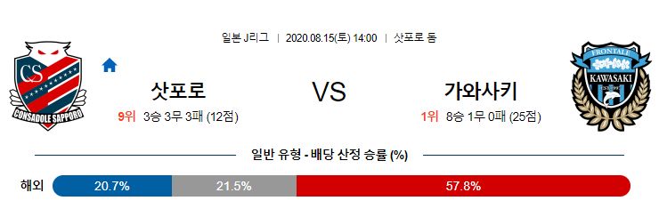 삿포로는 개막 이후 9경기에서 3승 3무 3패를 기록했습니다. 아라노 타쿠로와 송크라신을 앞세운 공격력이 좋은 팀으로, 팀내 득점 1위 스즈키 무사시까지 직전 라운드에 복귀하며 최상의 전력을 갖췄습니다. 상대팀 가와사키는 어떤 팀을 상대로도 득점할 수 있는 강력한 공격능력을 올 시즌 보여주고 있습니다. 올 시즌에는 하세가와 타츠야의 활약으로 팀을 이끌고있고, 다미앙 역시 득점포를 가동시키기 시작했습니다. 홈팀 삿포로는 최근 2경기 모두 세 골을 실점하며 수비진의 문제로 인해 어려운 경기를 하였습니다. 이때문에 올 시즌 경기력이 좋은 가와사키를 상대로 홈팀 삿포로가 변수를 만들어내긴 어려워보입니다.
