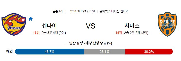 베갈타는 선수단이 작년 시즌에 비해 좀 더 기대해볼만하게 바뀌었습니다. 최근 5경기 연속 득점에 성공했습니다. 하지만 여전히 수비문제를 보이며 득점과 무관하게 대패하는 경기도 종종있습니다. 시미즈는 실점 이후 만회하는 능력은 분명 가지고있지만, 역시 수비조직력이 워낙 좋지않기때문에 멀티실점으로 패하는 빈도가 높습니다. 최근 사간도스와 오이타 등 하위팀들을 상대하며 패배를 면하며 결과를 만들어내고 있습니다. 다행히 시미즈는 최근 득점력이 되살아나며 4경기에서 2승 2무로 선전하고 있습니다. 원정에서 아직까지 승리는 없지만 수비 조직력을 점차 끌어올리는 단계입니다. 베갈타는 홈에서 아직까지도 승리가 없고, 시미즈를 상대로 주도권을 쥘 수는 있겠지만 많은 득점으로 차이를 만들어 내기에는 쉽지않아보입니다.