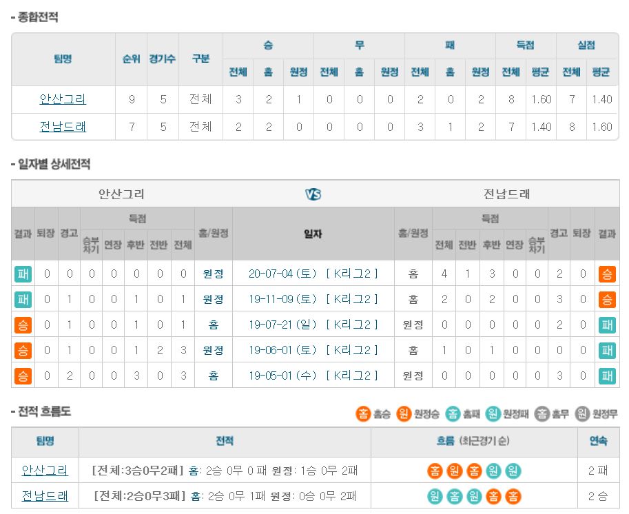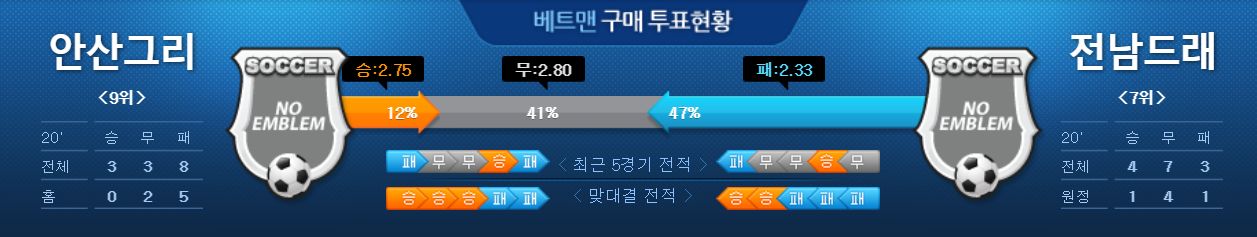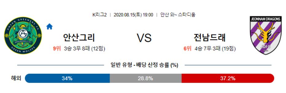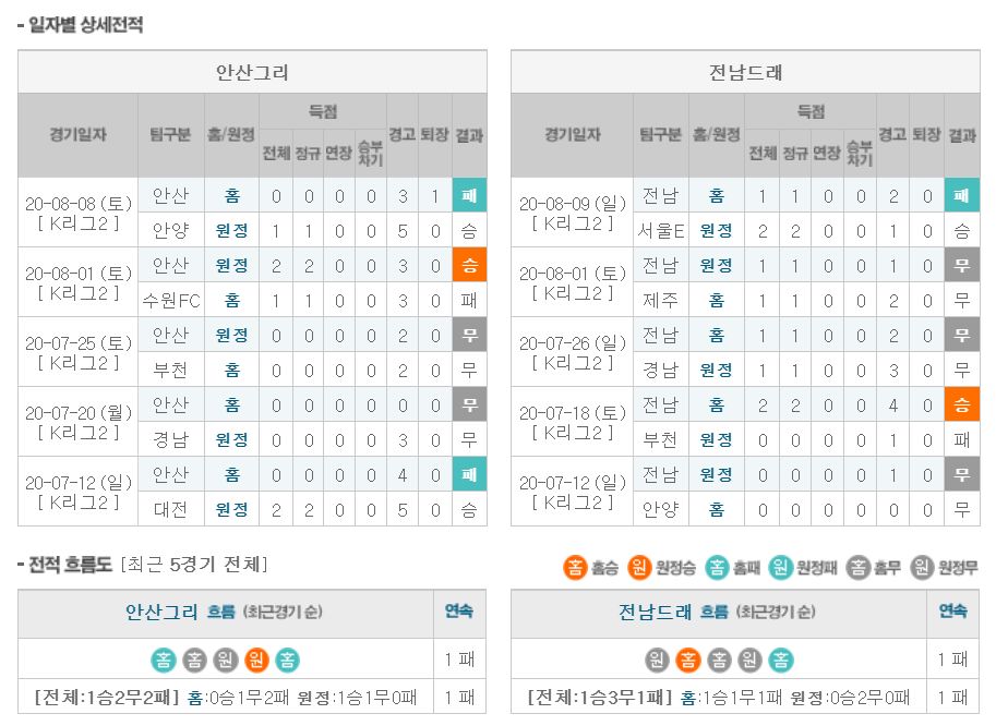 안산은 펠리팡이 합류하고 나서 점차 나아진 경기력을 보였습니다. 하지만 얇은 선수층으로 이마저도 금새 한계가 찾아 왔습니다. 안산이 주로 사용하는 라인을 내리고 역습을 노리는 전술은 대부분의 하위권 팀들이 비슷하게 사용하는 전술이지만, 안산은 역습전개 속도가 느린 편이기 때문에 경기중 많은 기회를 많이 만들어내지 못하고있습니다. 더욱이 이번 경기는 직전 경기 퇴장당한 펠리팡이 결장합니다. 전남의 기본적 전술 또한 라인을 내리고 역습을 노리는 패턴입니다. 추정호과 쥴리안 등이 이 전술을 잘 수행하고 있습니다. 그러나 믿었던 이종호와 올렉 등의 부상으로 인해 베스트 전력을 사용하기 힘든 상황입니다. 직전 이랜드전에 패하며 5경기 연속 무패행진을 마감했습니다. 주요 선수들이 부상로 이탈해 있지만 여전히 준수한 경기력을 보이고는 전남은 올 시즌 원정에서 득점력이 워낙 떨어지기 때문에 안산의 골문을 열기에는 쉽지않아보입니다. 양팀의 지루한 공방전이 이어질 것으로 보입니다.