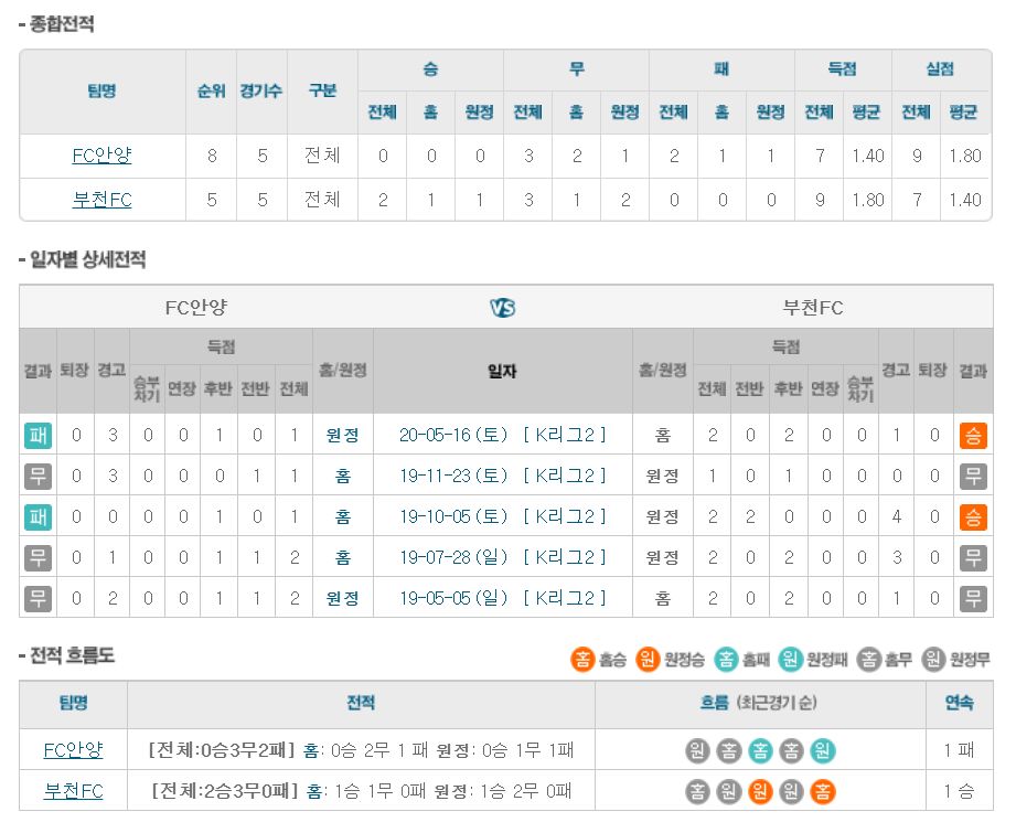 안양은 최근 전남과 아산 등 수비라인을 깊게 내린 팀들을 상대로 무승부에 그치며 상대의 밀집 수비를 공략하는 힘을 제대로 보여주지 못하고있습니다. 특히, 홈에서는 0승 2무 4패로 경기력이 좋지 않습니다. 부천은 바비오와 바이아노 등 용병 공격진들의 기량이 나쁘지않은 것으로 확인됐고, 빠른 역습과 세트피스에서 자신들의 강점을 잘 활용해서 올 시즌 5승을 하고 있습니다. 하지만 바이아노가 빠진 최근 3경기에서 단 1득점도 성공하지 못하며 무기력한 경기력이었습니다. 다행히도 직전 리그 1위 수원FC전에 조수철와 이현일 등이 득점하며 리그 1위팀에 승리를 거뒀습니다. 홈에서 유독 무기력한 패배가 많았던 안양입니다. 경기 시간이 지나갈 수록 부천FC가 결국에는 활로를 찾아낼 가능성이 높아보입니다.