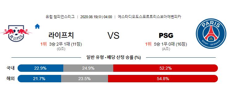 양 팀 모두 물러서지 않는 경기 운영을 선호합니다. 중원에서 치열한 싸움과, 공수 전환시 빠르고 안정감있는 움직임을 통한 득점 생산 능력에 성패가 갈릿 것입니다. 이 부분에서 상대적 우위를 점하는 쪽은 PSG라 할 수 있습니다. 라이프치히는 주로 측면 자원들에 의존하는 단순한 공격 패턴을 보이는 반면 최전방의 무게감은 PSG에 비해 떨어지는 편입니다. PSG가 핵심 공격 자원 활용에 강점을 드러낼 것입니다. 빠리고 원활한 기회 창출, 골고루 배치된 능력있는 선수들의 득점 지원을 더해 결승 진출에 성공할 것으로 보입니다.