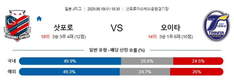 삿포로는 개막 이후 10경기에서 3승 3무 4패를 기록하고 있습니다. 아라노 타쿠로와 송크라신을 앞세운 공격력이 좋은 팀으로 평가 받고 있습니다. 그리고 최근 팀내 득점 1위 스즈키 무사시까지 복귀하며 최상의 전력을 갖췄습니다. 오이타는 올 시즌을 앞두고 선수단 개편이 있었기에 올 시즌 경기력에 물음표가 달렸습니다. 다행히도 리그 개막 이후 초반 좋은 경기력을 보였지만 너무 많은 패배를 허용하고있고, 특히 원정에서는 1승 0무 4패의 부진을 보이고 있습니다. 최근 두 팀 모두 수비조직력이 붕괴된 상황이기 때문에 어느쪽으로도 기울어질 수 있는 경기지만, 그중 최근에 경기력에 문제를 보이는 팀은 매 경기 3실점 이상 허용하고있는 삿포로라고 할 수 있습니다. 오이타는 지난 시즌에도 삿포로를 상대로 멀티득점을 올리며 승리를 만들어 냈습니다. 오이타는 요코마리를 상대로 최근의 부진을 털어낼 수 있는 승리를 하였고 삿포로와의 최근 상대전적과 직전경기 승리의 영향으로 최근 5경기에서 14실점을 하고 있는 삿포로를 상대로우세한 경기를 할 것으로 보입니다.