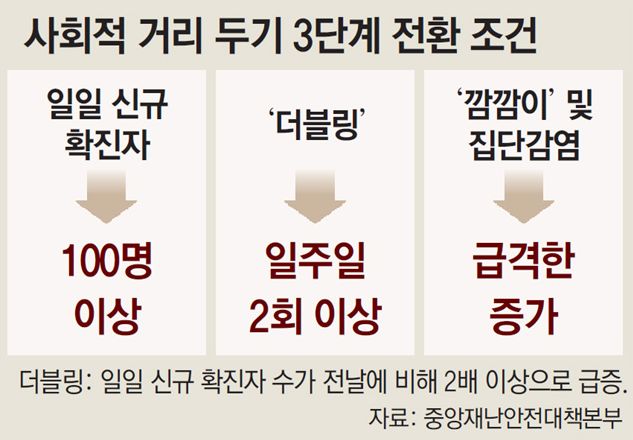 방역당국의 사회적 거리두기 3단계 격상 조건을 살펴보면 일일 확진자수가 100명 이상 / 확진자 수가 2배 이상 증가하는 이른바 '더블링 현상'이 일주일에 2회 이상 발생 / '깜깜이' 확산 등으로 인한 집단감염이 급증하는 때에 사회적 거리두가 3단계로 방역 수위를 올릴 수 있습니다.