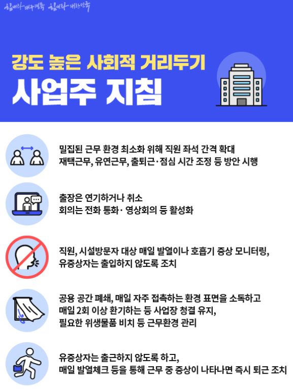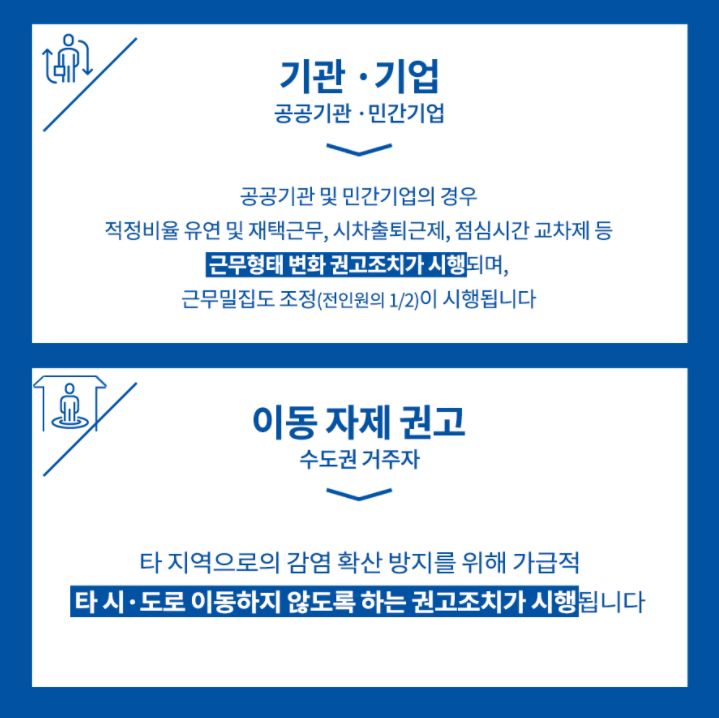 △실내 50인이상, 실외 100인이상 집합·모임·행사 금지 △스포츠 행사 무관중 경기 △유흥주점 등 고위험시설(유통물류센터 제외) 12종 운영 중단(고위험시설에 결혼식장 뷔페 추가 지정, 8월 19일 18시부터 적용) △다중이용시설 중 결혼식장, 영화관 등 위험도가 높은 일부 다중이용시설(12종) 방역수칙 의무화 △사회복지이용시설 및 어린이집 휴관, 휴원 권고(긴급돌봄 등 필수서비스 유지) △실내 국공립시설 운영 중단 △학교 원격수업 전환 △(공공기관) 유연, 재택근무 등을 통해 근무인원 제한 △(민간기관, 기업) 공공기관과 유사한 수준으로 근무인원 제한 권고 등을 시행하고 있습니다.