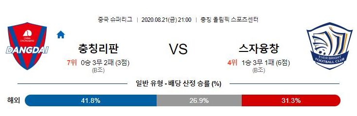 충칭은 시즌을 앞두고 감독까지 교체하며 당장의 전력유지가 어려운 상황입니다. 어려운 상황에도 2라운드 이후 톈진과 허베이, 칭다오 상대로 차례로 무승부를 거두며 나름의 경쟁력을 보이고있습니다. 스좌창은 2부리그에서도 압도적인 전력을 보이지는 못했던 팀으로, 올 시즌 승격에 성공하긴 했지만 1부리그에서의 경쟁력에 대해서는 여전히 의문이 드는 팀입니다. 그래도 현재까지 1승 3무 1패로 기대이상의 성적을 기록하고 있습니다. 특히 용병선수들이 1부리그에서도 충분히 자기 몫을 해내며 괜찮은 경기력을 만들어내고있습니다. 충칭도 전력에 비해 괜찮은 경기력을 보이고 있지만 득점력 부족으로 허무하게 패하는 경기들도 나오고있으며, 최근의 스좌창의 경기력과 압신 코트비 감독의 전술이라면 원정이지만 변수를 만들어 내기에 충분해 보입니다.