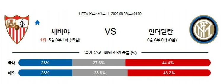 인테르의 6:4 우세가 예상됩니다. 세비야는 에이스 오캄포스가 100% 컨디션이 아닌 상태로 인테르의 5백 수비를 공략해야 하는 상황입니. 샤흐타르의 브라질리언 4인방을 완벽 봉쇄한 인테르 수비 앞에서 세비야 공격진 또한 공략이 쉽지 않을 것입니다, 골 결정력 면에서도 루카쿠와 라우타로를 앞세운 인테르 쪽이 우위를 점할 수밖에 없는 상황입니다. 세비야의 유로파리그 DNA 및 로페테기 감독의 지도력 등을 과소평가해선 안되겠지만, 객관적 전력과 분위기에서 인테르가 우위에 있음을 확실합니다.