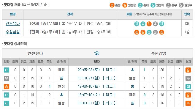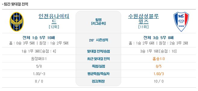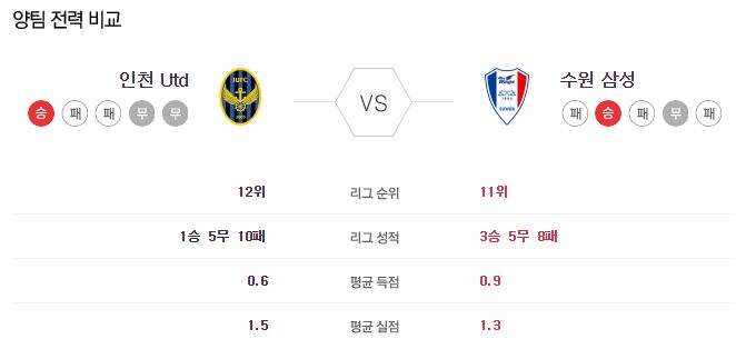 ▶인천 vs 수원 5경기 맞대결 전적 1승 1무 3패(인천 홈 1무 1패)