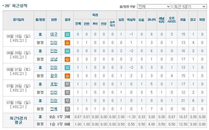 ▶인천 최근 3경기 1승 2패(2득점 5실점)