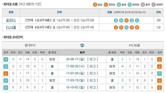 ▶광주 vs 서울 5경기 전적 1승 4패(광주 홈 1승 2패)