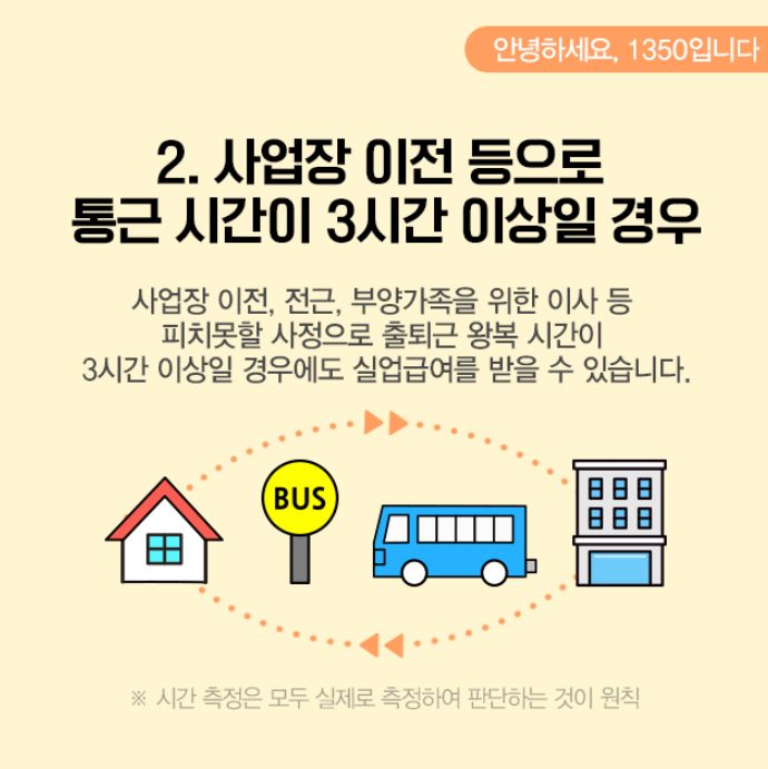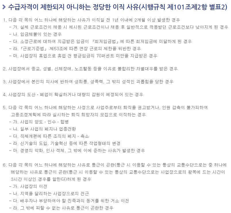 먼저 거주지 이전에 대한 부분은 배우자 또는 직계가족과의 합가를 위한 이전이어야 하며 회사와 집까지 왕복 3시간 이상 거리여야 합니다. 또한 본인의 질병, 장애, 임신, 출산 같은 경우 무조건 위의 사유로 내가 퇴직한다고 실업급여 조건에 해당되는 것은 아닙니다. 위의 사유로 인해 근로자가 회사에 병가, 휴직, 보직이전 등을 요청했지만 받아들여지지 않았을 때 의사소견서 등을 첨부하여 실업급여 인정이 가능합니다.