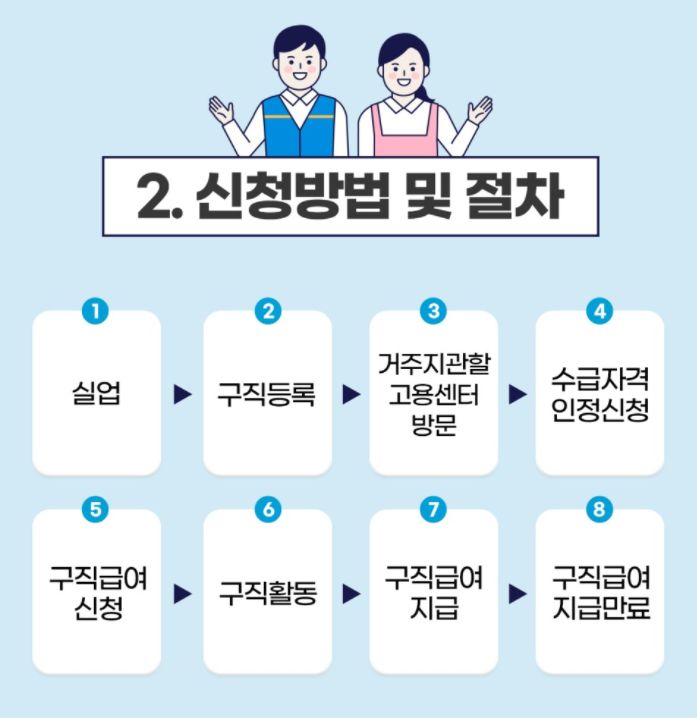 간단하게 말하자면 실업상태가 된 후에 ① 본인이 직접 워크넷을 통해 ‘구직등록’을 신청해야 합니다. ② 다음으로는 거주지 관할 고용센터를 방문하거나 온라인을 통해 ‘수급자격 신청자 교육’을 수강해야 하죠. ③ 이후 수급자격 인정신청을 해야 하는데요. 수급자격이 인정되면 통상 4주 단위로 재취업활동(구직활동)을 2회 이상 하고, 고용센터를 방문하거나 인터넷을 통해 실업인정 신청을 하여야 합니다. ④ 마지막으로 고용센터에서 재취업활동(구직활동) 내용을 확인하고 다음 날 구직급여를 지급하게 됩니다.