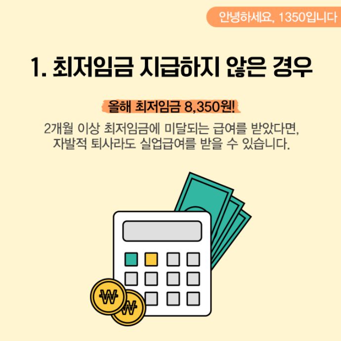 그리고 임금체불의 경우 급여가 2개월 이상 연속해야 체불된다면 퇴직사유가 됩니다. 그리고 기간제 근무, 정년퇴직 등으로 계약이 만료 되었을 때 역시 정당한 퇴직사유가 됩니다. 이 외에도 8가지 추가로 실업급여 조건으로 인정되는 비자발적 사유가 있으니 위의 사진을 참고하셔서 본인의 실업 퇴직사유를 찾아보시길 바랍니다.