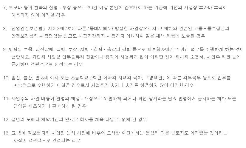 먼저 거주지 이전에 대한 부분은 배우자 또는 직계가족과의 합가를 위한 이전이어야 하며 회사와 집까지 왕복 3시간 이상 거리여야 합니다. 또한 본인의 질병, 장애, 임신, 출산 같은 경우 무조건 위의 사유로 내가 퇴직한다고 실업급여 조건에 해당되는 것은 아닙니다. 위의 사유로 인해 근로자가 회사에 병가, 휴직, 보직이전 등을 요청했지만 받아들여지지 않았을 때 의사소견서 등을 첨부하여 실업급여 인정이 가능합니다.