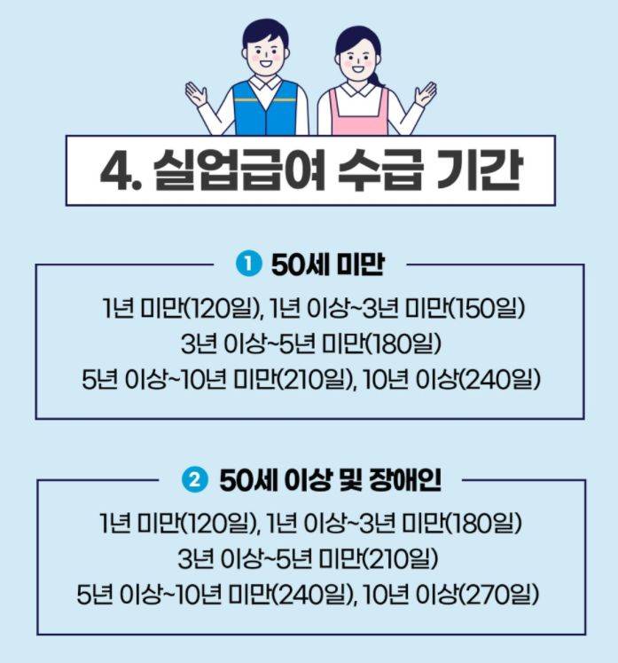 ▷50세 이상 및 장애인 : 1년 미만(120일), 1년 이상~3년 미만(180일), 3년 이상~5년 미만(210일), 5년 이상~10년 미만(240일), 10년 이상(270일)