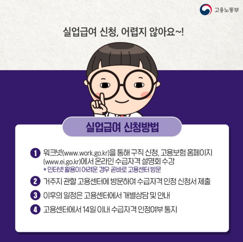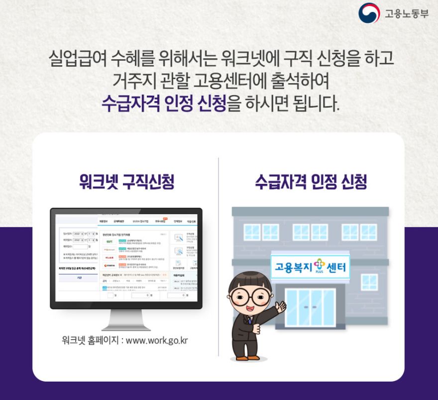 간단하게 말하자면 실업상태가 된 후에 ① 본인이 직접 워크넷을 통해 ‘구직등록’을 신청해야 합니다. ② 다음으로는 거주지 관할 고용센터를 방문하거나 온라인을 통해 ‘수급자격 신청자 교육’을 수강해야 하죠. ③ 이후 수급자격 인정신청을 해야 하는데요. 수급자격이 인정되면 통상 4주 단위로 재취업활동(구직활동)을 2회 이상 하고, 고용센터를 방문하거나 인터넷을 통해 실업인정 신청을 하여야 합니다. ④ 마지막으로 고용센터에서 재취업활동(구직활동) 내용을 확인하고 다음 날 구직급여를 지급하게 됩니다.