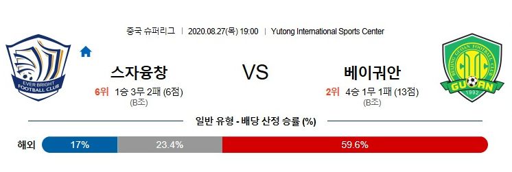 베이징 궈안(지난 시즌 2위, 승승승무패)는 직전 경기(vs 상하이 상강) 1-2 패배로 분위기가 좋지 않습니다. 하지만 객관적 우위가 완연한 이번 라운드에서 반등을 노릴 것입다. 꾸준히 득점을 기록하고 있는 공격진 경기력은 좋습니다. 공격 전개를 주도하는 장 시저(AMF) 중심으로 부분 전술을 효과적으로 활용하고 있습니다. 측면 수비진의 적극적 공격 가담, ‘바캄부-비에이라’ 1선의 폭 넓은 활동 반경이 꾸준한 찬스를 만들어 내고 있습니다. 최근 일정에서 실점 빈도가 급증한 원인은 중원의 수비 가담이 줄어든 탓입니다. 다만 스좌장의 역습 완성도가 떨어지기에 이번 경기에서 지난번과 같은 불안한 모습은 없을 것입니다.