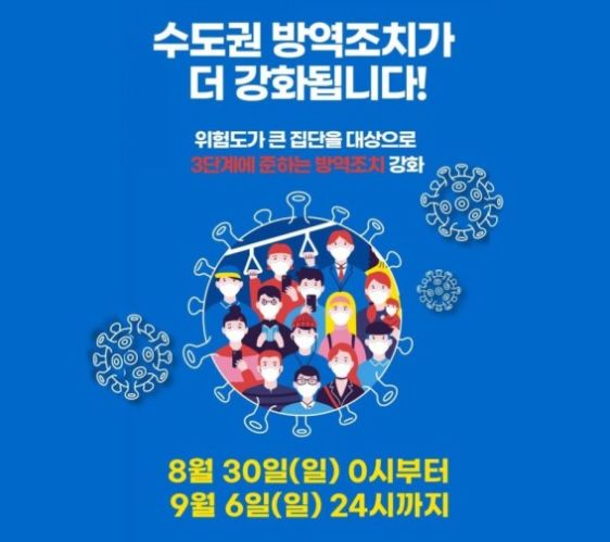 최근 수도권에서 코로나19 일일 확진자 수가 열흘 넘게 200~300명을 초과하며 국내 누적확진자 2만 명이 넘었습니다. 이에 따라 수도권 대상으로 강화된 사회적 거리두기 2.5단계가 실시되었습니다. 8월 30일 ~ 9월 6일까지 일주일 간 시행된다고 합니다. 그동안 사회적 거리두가 3단계을 하게되면 모든 경제활동이 멈춰버리는 심각한 부작용을 일으키기에 3단계 실시에 대해 관심이 높았는데, 그전에 사회적 거리두기 2.5단계를 먼저 실시한다고 알렸습니다.