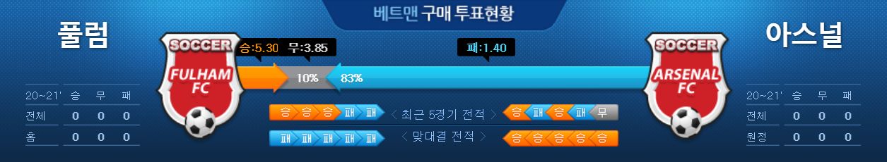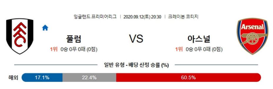 아스날은 지난 시즌 왕성한 활동량을 바탕으로 압박능력이 좋은 하위 팀들에 줄곧 발목을 잡혔습니다. 여기에 원정 경기에 유독 약한 모습을 보였습니다. 객관적으로 풀럼의 경기 운영 방식은 확실한 컨셉 하에 완성도를 높이고 있고, 승격 첫 홈 일정이라는 엄청난 동기부여까지 존재합니다. 풀럼이 이번 경기를 맞이 하는 정신과 동기부여로 인해 승점을 획득하는 성과를 낼 가능성이 높아 보입니다.
