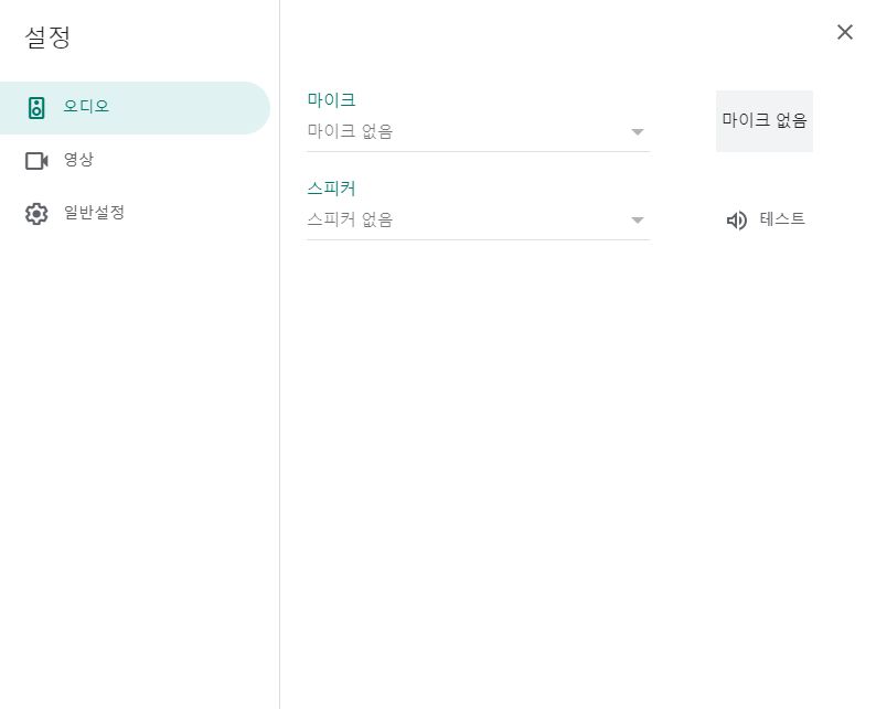 구글 미트 화상회의를 위한 카메라와 마이크 설정은 화면의 마이크 아이콘과 카메라 아이콘을 클릭해서 간편하게 변경 및 수정이 가능합니다. 위의 이미지와 같이 각각의 아이콘에 사선이 그려져 있으면 off되 있는 상태입니다. 오디오와 영상 등의 좀 더 세밀한 기타 설정은 화면의 설정 탭을 클릭해서 사용자에 맞게 수정하시면 됩니다.