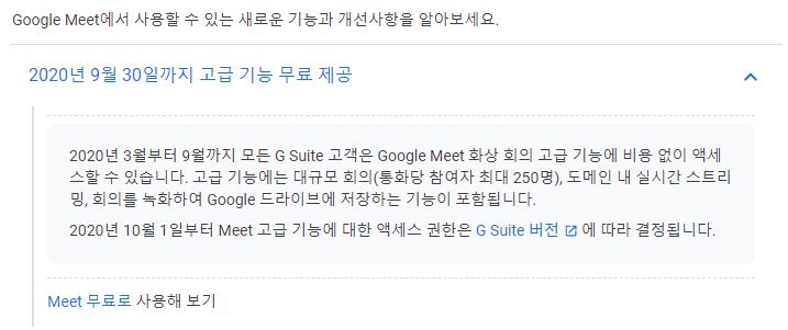 하지만 구글 미트의 가장 큰 장점은 사용시간에 제한이 없는 것입니다. 무료 사용 가능한 이용이 줌은 40분이지만, 구글 미트는 9월 말까지는 무제한 사용 가능하기 때문에 필요한 시간에 맞게 선택하여 이용이 가능합니다. 안타깝게도 이 무제한 사용은 10월 1일부터는 무료 사용 가능한 시간이 60분으로 바뀌기 때문에 참고하셔야 합니다.