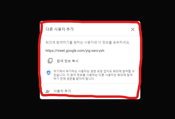 회의방을 만들었다면, 회의를 위해 다른 사용자 또는 참가자를 추가, 초대하기 위한 창이 뜹니다. 자신이 개설한 회의의 주소인 url을 복사한 후 이메일, 문자, 톡 등으로 초대하고자 하는 사람에게 전송해도 되고, 사용자 추가를 클릭해서 초대하기도 가능합니다.