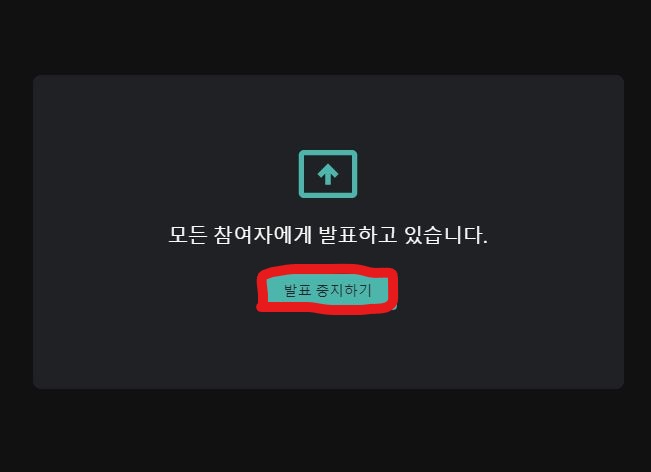 저는 미리 ppt 화면을 열어 뒀었는데요, 이걸 선택하니 이렇게 구글 미트를 통해 공유되는 것을 확인할 수 있었습니다. 이렇게 문서를 공유하다가 다시 화면으로 돌아오고 싶을 때는 구글 미트 창을 열고난 후 발표 중지하기 버튼을 클릭하면 됩니다. 그러면 문서 공유가 끝나고 화면에는 호스트의 모습이 다시 등장하게 됩니다.
