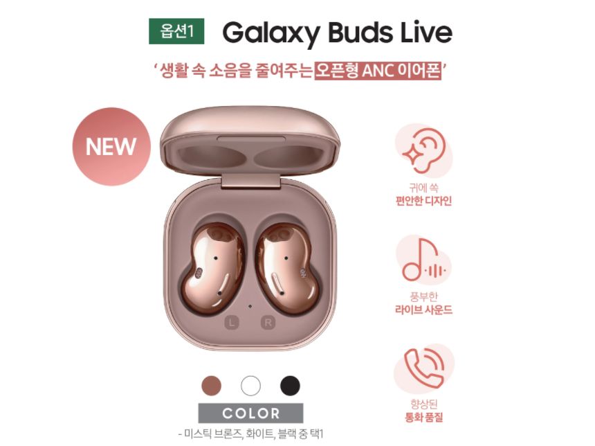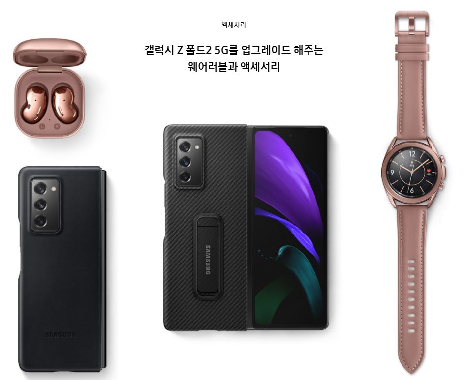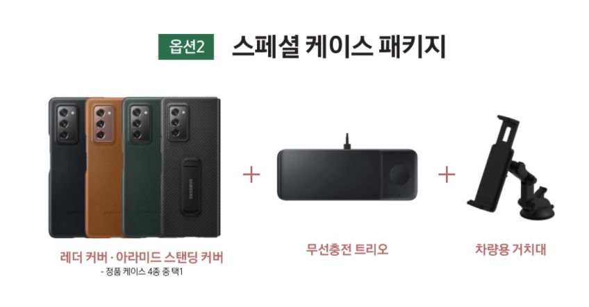 갤럭시 Z 폴드2 구매시 삼성전자에서 제공되는 사은품은 버즈 라이브 또는 케이스 패키지 중에서 한 가지 선택이 가능합니다.. 버즈 라이브 색상은 미스틱 브론즈, 화이트, 블랙 3종이고, 케이스 패키지 구성은 케이스 정품 1종(4종 중 택 1) + 무충트리오, 차량용 거치대입니다.