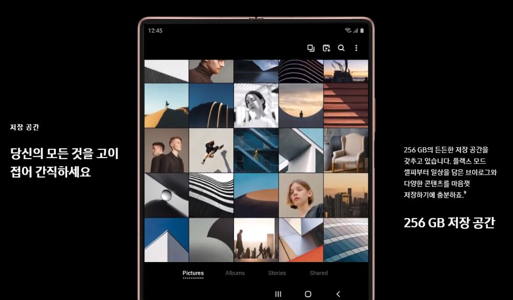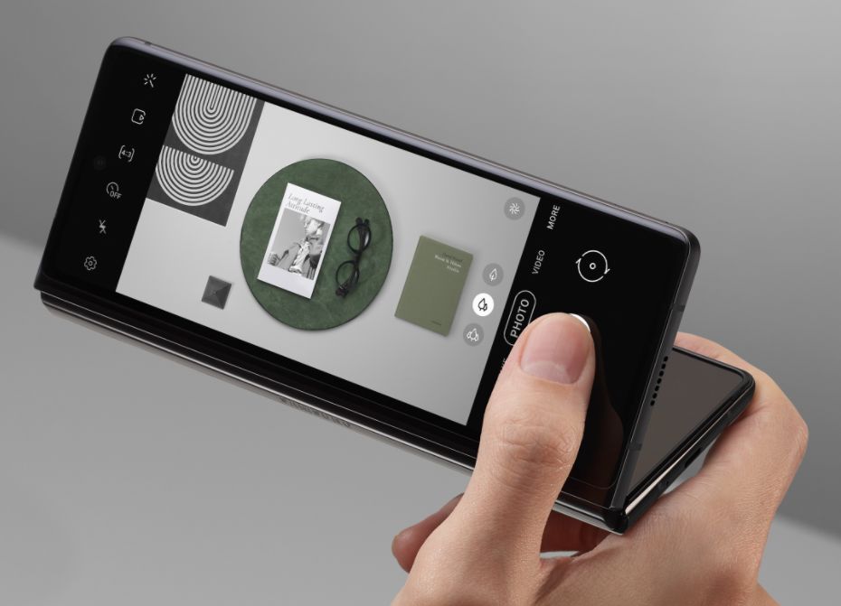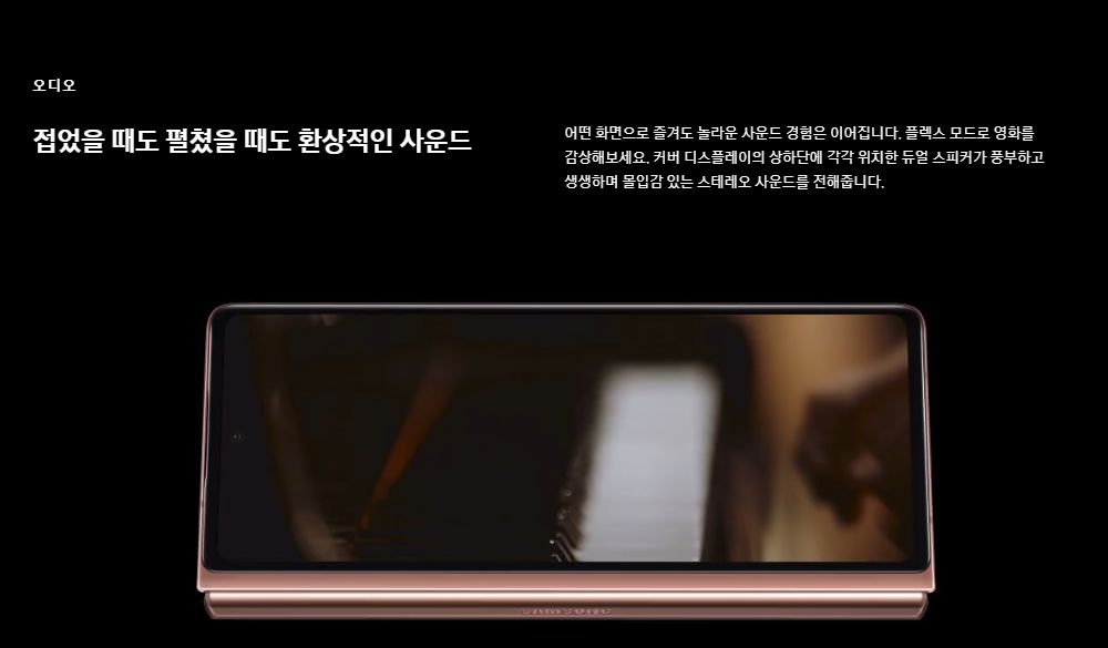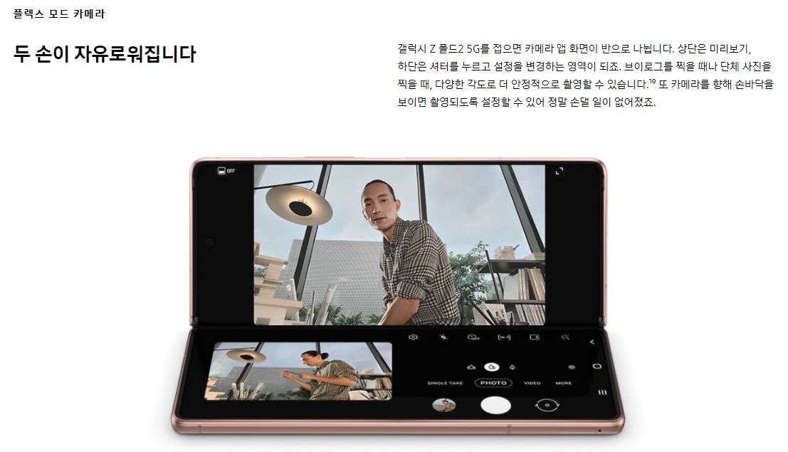 히든 힌지가 적용되어 사용자가 원하는 각도로 자유롭게 사용할 수 있고, 전작에 비해 접었다 펼 때 움직임이 꾀나 개선된 것으로 보입니다. 여기에 스마트폰 거치대 없이 간편하게 플렉스 모드를 활용할 수 있는 장점이 있습니다. 하이드어웨이 힌지 적용으로 사용자의 환경에 맞는 다양한 각도로 접고 세울 수 있기 때문에 영화와 유튜브 등의 동영상 감상하기도 편하고, 사진이나 동영상 촬영시 별도의 거치대 없이 안정감있는 촬영이 가능합니다.