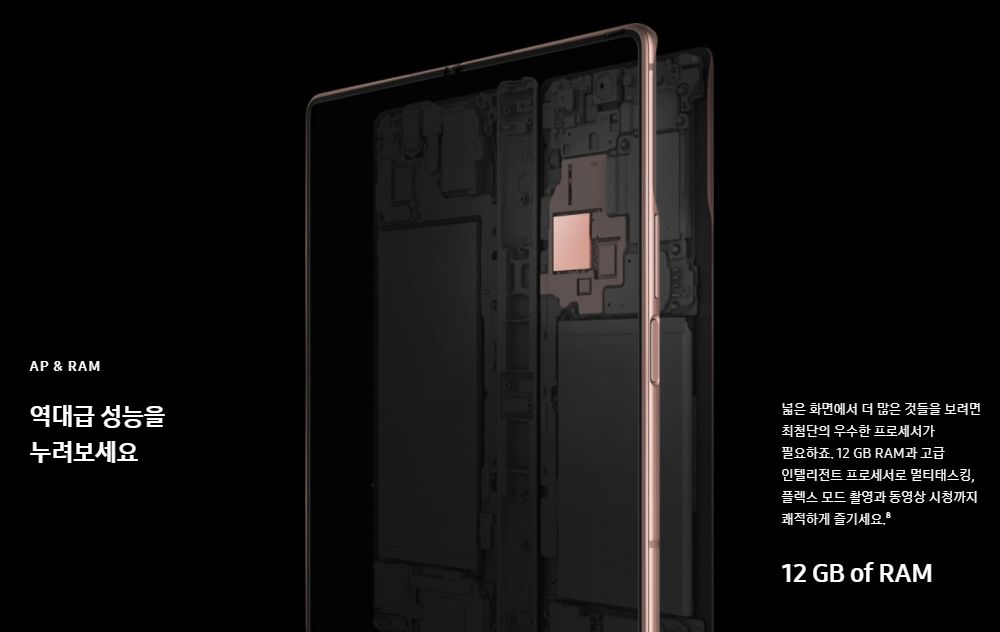 전체적인 크기를 살펴보면 접었을 때는 159.2 x 68.0 x 13.8~16.8mm이고, 펼치면 159.2 x 128.2 x 6.0~6.9mm의 크기를 자랑합니다. 무게는 282g입니다. 갤럭시 노트20의 무게가 192g, 노트20 울트라는 208g 임을 생각한다면 폴드2의 무게는 꾀나 무거운 편이라 할 수 있습니다.