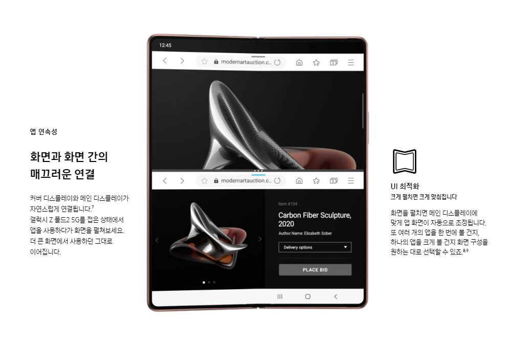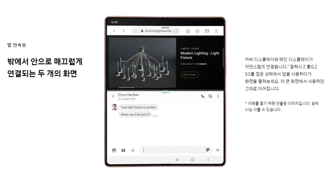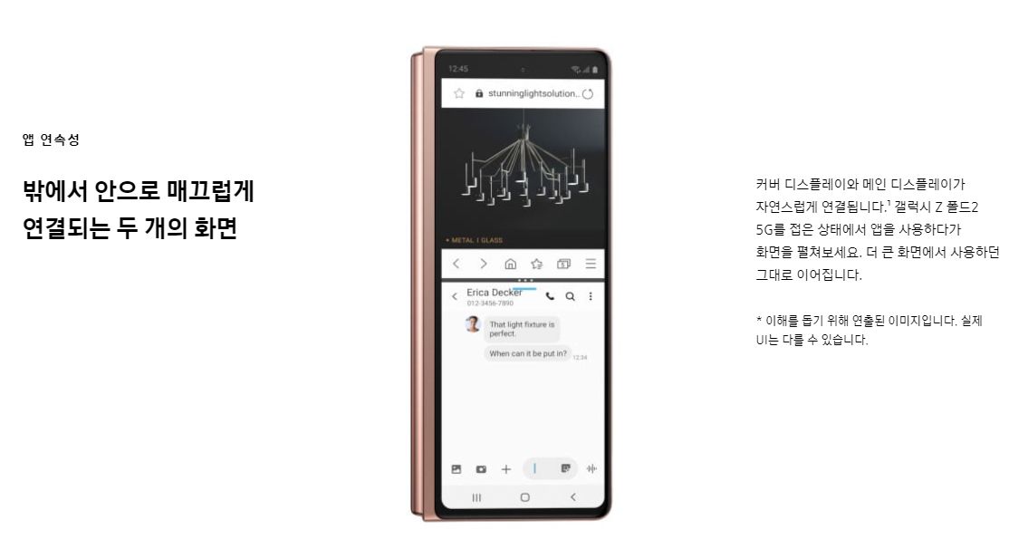 커버 디스플레이와 메인 디스플레이가 자연스럽게 연동이 됩니다. 디스플레이를 접은 상태에서 스마트폰을 사용하다가 화면을 펼치면 메인 디스플레이에서 사용하던 앱을 그대로 사용이 가능합니다. 또한 멀티 액티브 윈도우를 통해서 최대 3개의 앱을 메인 디스플레이에서 분할하여 사용이 가능합니다.