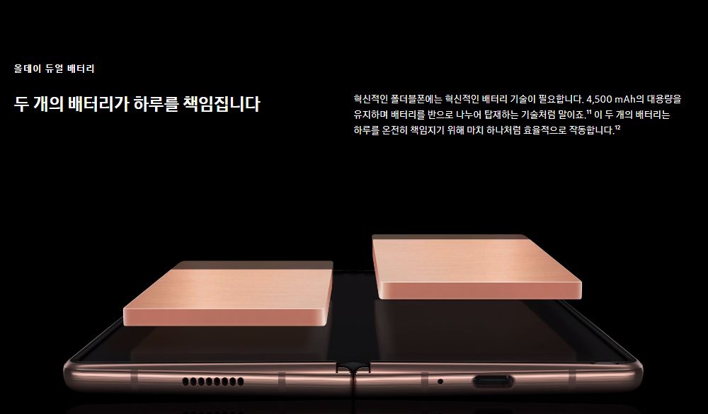 갤럭시 Z 폴드2의 배터리는 4,500 mAh의 대용량을 반으로 나눠서 탑재가 되었습니다. 전작의 경우 4.235mAh였는 것에 비해 소폭으로 조금 더 용량이 늘어났습니다. 카메라는 무려 5개가 탑재되었습니다. 커버에 있는 전면 카메라는 10MP (F.2. FF)이, 내부 전면에 있는 카메라는 10MP (F2.2)입니다. 후면에는 망원 카메라 12MP (F2.4), 광각 카메라 12MP (F1.8 2PD OIS), 초광각 카메라 12MP (F2.2)을 지원합니다.