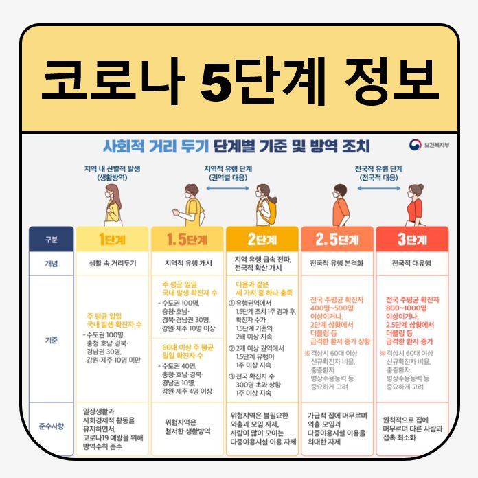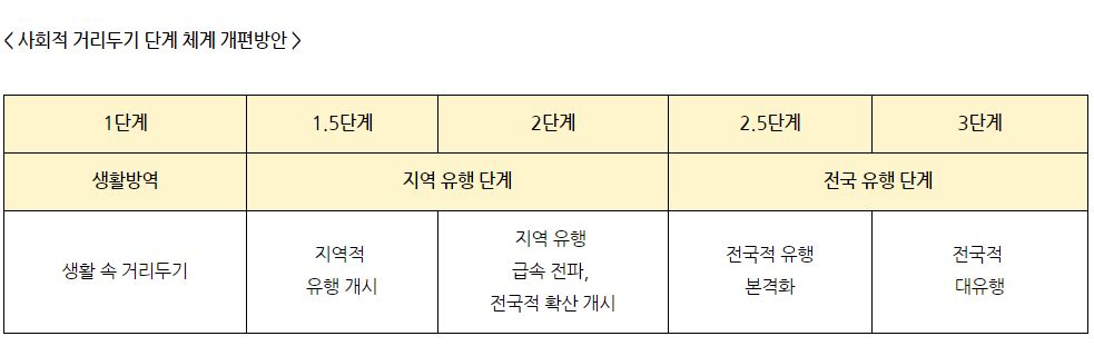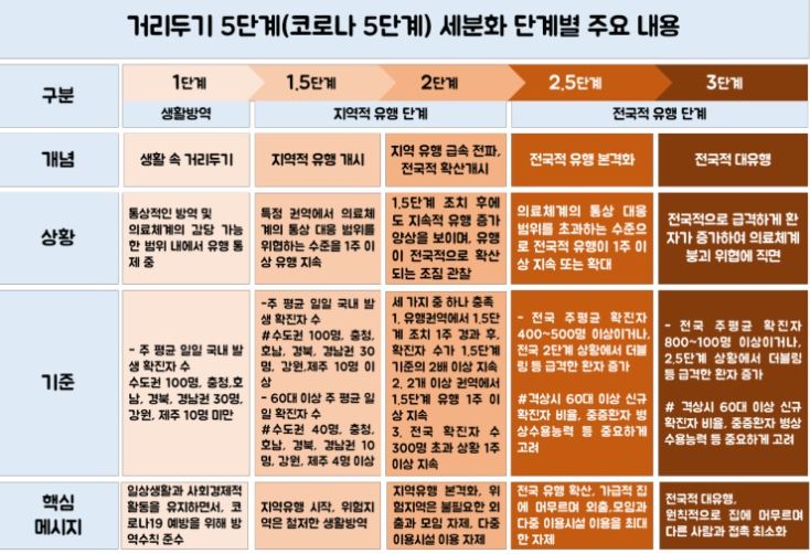 정부는 현행 '사회적 거리두기' 체제를 3단계에서 5단계로 세분화함과 동시에 경제적 어려움을 겪는 자영업자를 포함한 시민에게 심각한 생계위협이 되는 시설 운영중단 조치는 최소화하기로 했습니다. 신종 코로바이러스 감염증(코로나19) 상황의 안정적인 대비를 위해 보다 체계적이고 현실적인 방역체계 구축에 목적이 있다고 합니다.