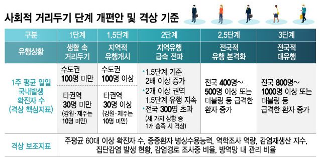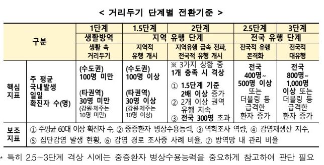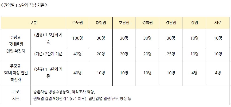 바뀐 규정에 따라 신규 확진자 규모가 권역별로 1단계 수준을 넘어서면 '지역적 유행의 시작'이라고 결정해 해당 지역의 거리두기를 1.5단계로 높입니다. 이와 함께 60대 이상 확진자 수가 일정 수준(수도권 40명, 충청·호남·경북·경남권 10명, 강원·제주도 4명)을 초과하는지도 함께 고려합니다.