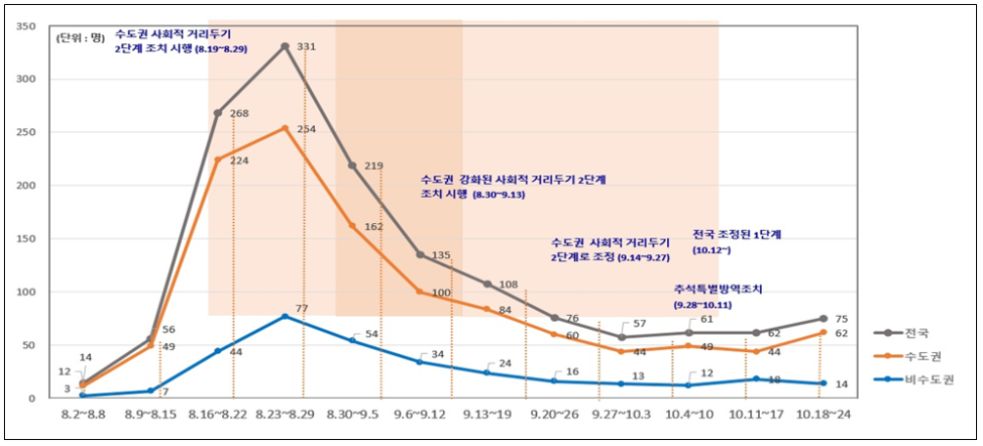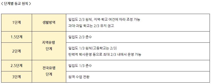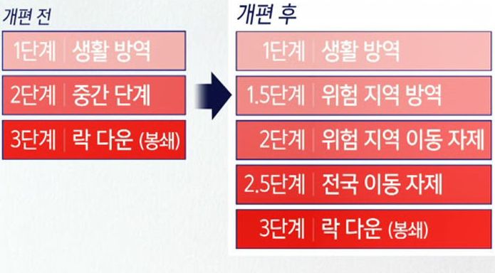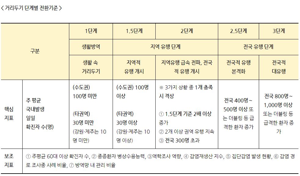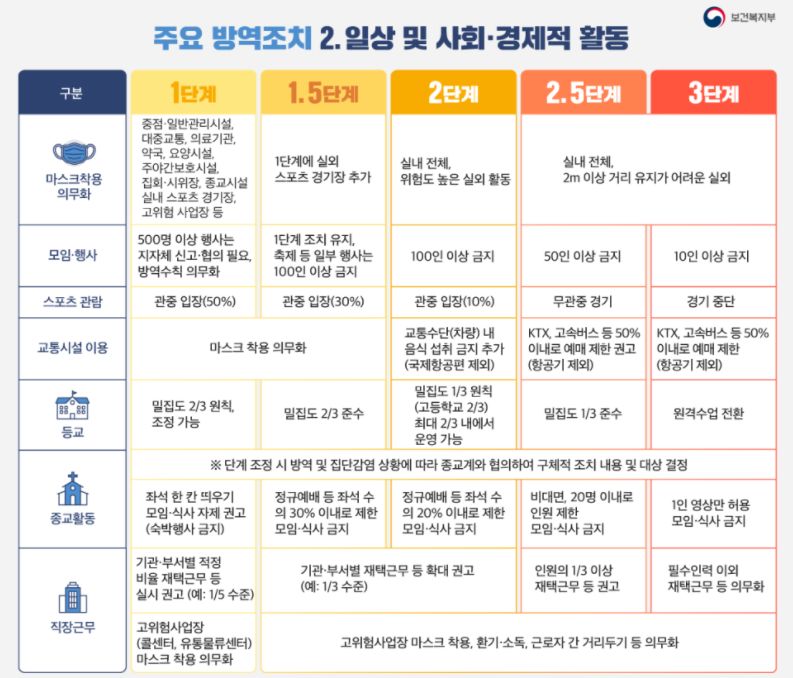 코로나19 상황을 생활방역(1단계), 지역유행(1.5, 2단계), 전국유행(2.5, 3단계)으로 크게 나누되 지역유행과 전국유행 단계를 보다 세분화해 1.5단계와 2.5단계를 신설했습니다. 단계 적용도 수도권, 충청권, 호남권, 경북권, 경남권, 강원, 제주 7개 권역으로 나눠 차등 적용한다고 알렸습니다.