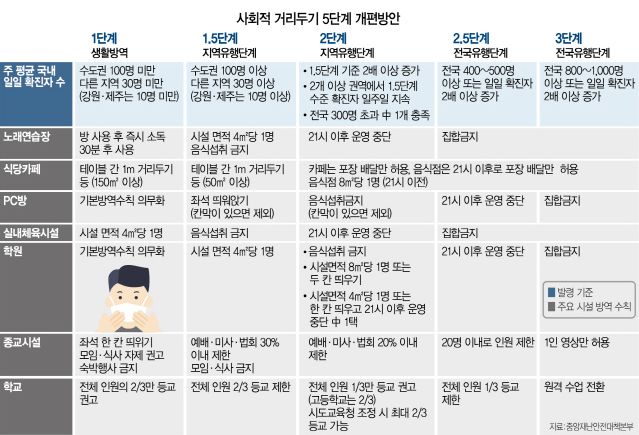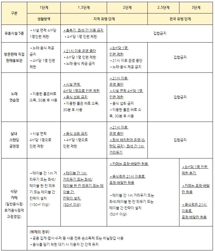 유흥시설 등과 같은 중점관리시설 9종의 경우 1.5단계 이용인원 제한, 2단계 유흥시설 5종 운영중단, 2.5단계 집합금지(영업금지) 조치가 내려지고, PC방 등과 일반관리시설 14종은 2.5단계에서 오후 9시 이후 영업중단, 3단계 집합금지 등의 순서로 조치가 강화됩니다.