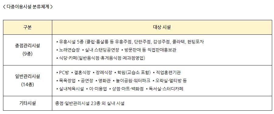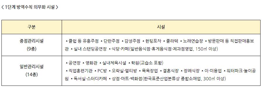 중점관리시설과 일반관리시설 23종은 공통적으로 1단계에서부터 마스크 착용과 출입자명단 관리, 환기·소독, 시설별 이용인원 제한 등 핵심 방역수칙을 반드시 지켜야 합니다. 이후 단계에서는 별도의 조치가 적용됩니다.