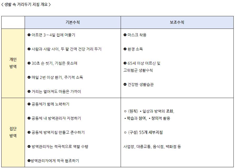 각 시설과 활동에 대한 일방적이로 획일적인 대처를 대신해 위험도 변화에 따라 단계적으로 운영시간이나 이용인원을 능동적으로 제한하기로 했습니다. 코로나19 바이러스의 전염을 최대한 억제하기 위해 사회적 거리두기 1단계에서부터 23종의 다중이용시설에 대한 마스크 착용 등과 같은 핵심방역 수칙을 의무화합니다.