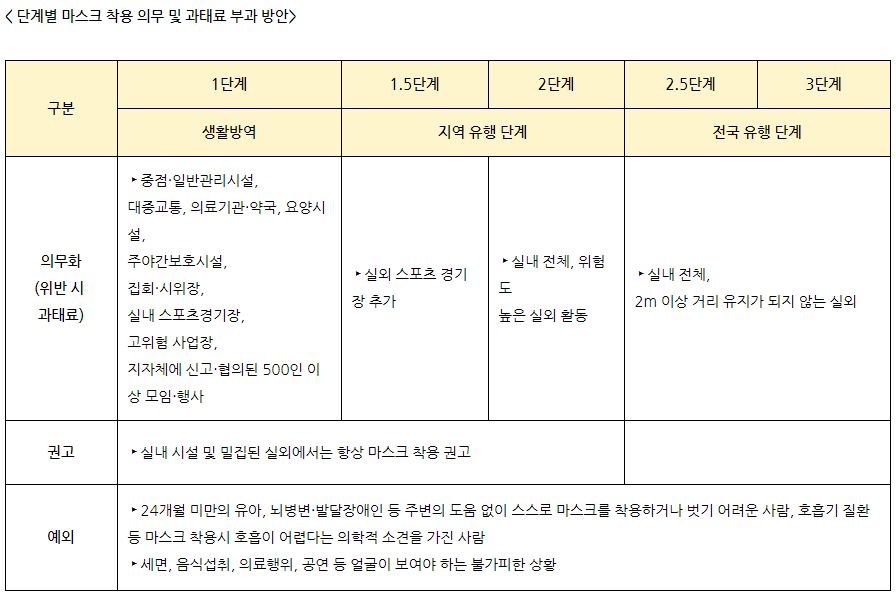 마지막으로 정부는 방역조치에 대한 책임성 또한 강화하기로 했습니다. 11월 7일부터 방역수칙을 위반한 운영자와 관리자에게는 300만원 이하, 시설 이용자에게는 10만원 이하의 과태료를 부과한다고 합니다. 또한 마스크 미착용자에 대한 과태료는 이달 13일부터 부과한다고 합니다.