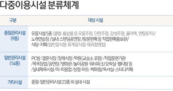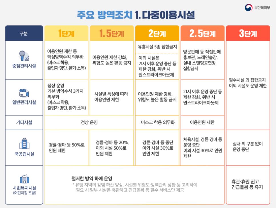 유흥시설 등과 같은 중점관리시설 9종의 경우 1.5단계 이용인원 제한, 2단계 유흥시설 5종 운영중단, 2.5단계 집합금지(영업금지) 조치가 내려지고, PC방 등과 일반관리시설 14종은 2.5단계에서 오후 9시 이후 영업중단, 3단계 집합금지 등의 순서로 조치가 강화됩니다.