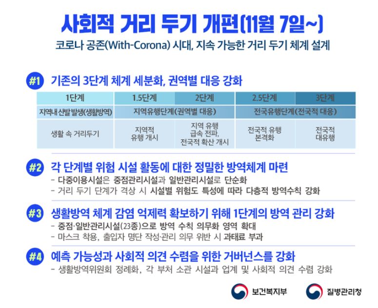 정부는 현행 '사회적 거리두기' 체제를 3단계에서 5단계로 세분화함과 동시에 경제적 어려움을 겪는 자영업자를 포함한 시민에게 심각한 생계위협이 되는 시설 운영중단 조치는 최소화하기로 했습니다. 신종 코로바이러스 감염증(코로나19) 상황의 안정적인 대비를 위해 보다 체계적이고 현실적인 방역체계 구축에 목적이 있다고 합니다.