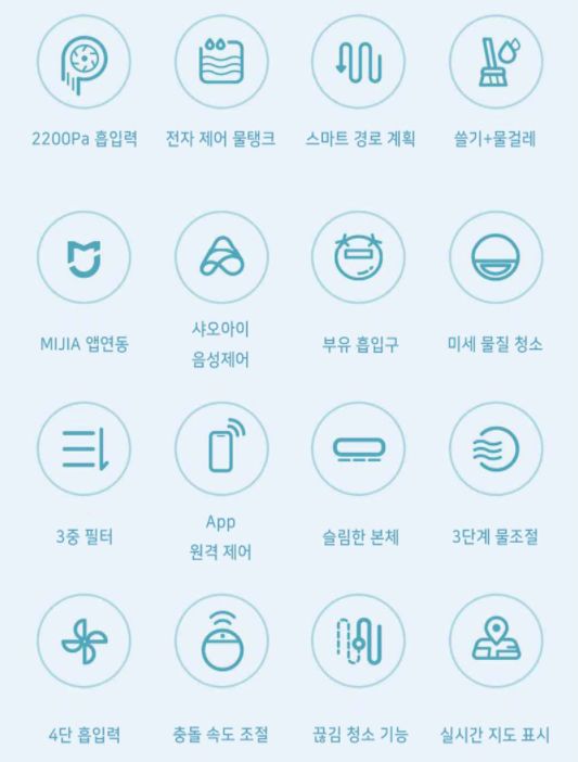 본격적인 후기에 앞서 샤오미 로봇청소기 미지아 G1의 제원(성능)에 대해서 잠깐 보고 가겠습니다. 이 제품은 무려 16가지의 특징이 있습니다. 2200pa 흡입력, 전자제어물탱크, 스마트맵핑, 쓸기/닦기 일체형, 미지아 연동, 부양식 물걸레, APP 원격제어, 적외선 충돌감속, 실시간 지도표시 기능 등이 있습니다.
