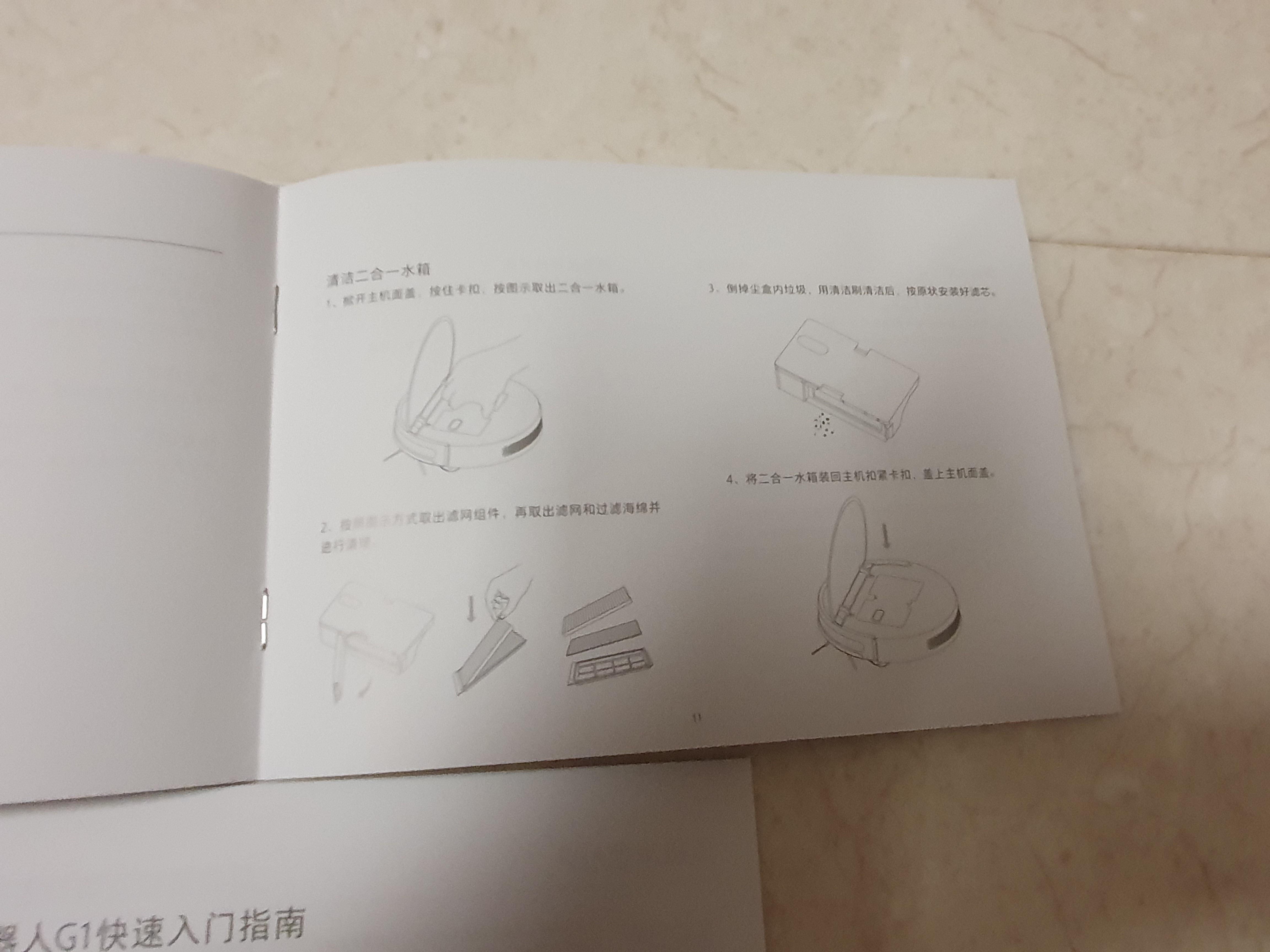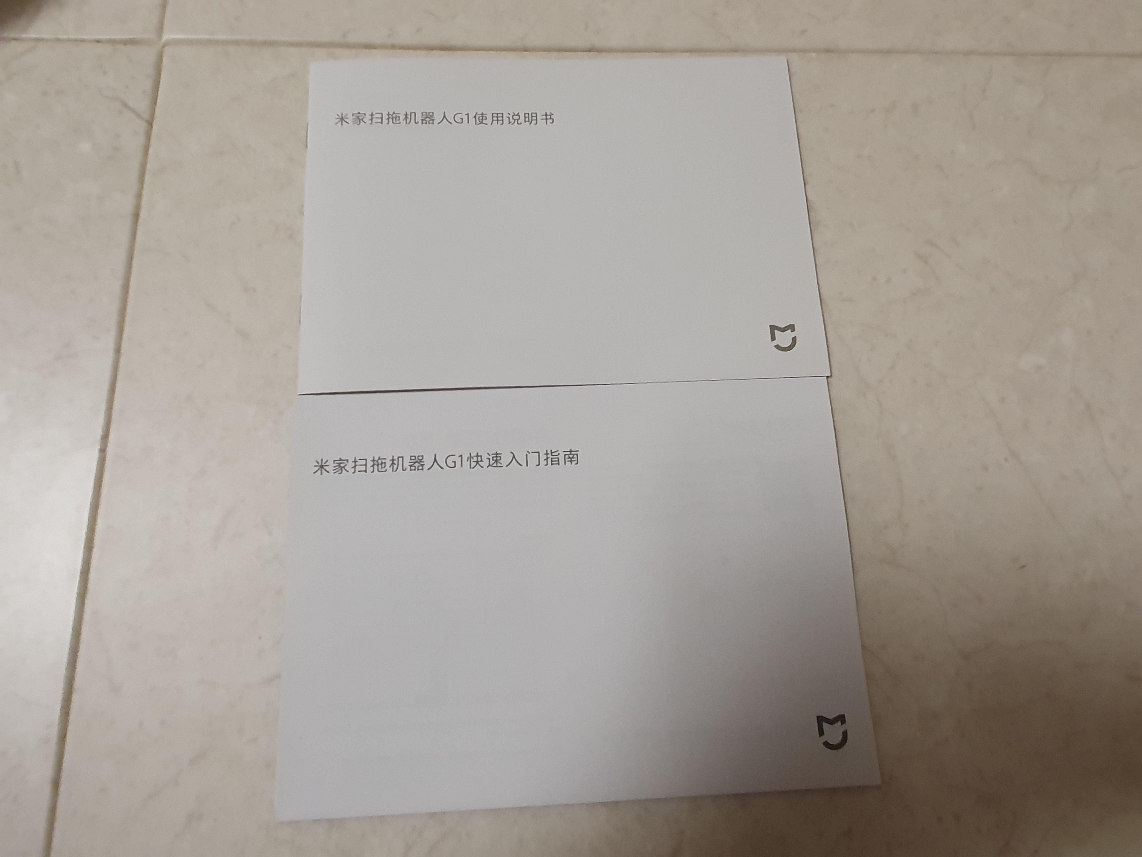 샤오미 로봇청소기 미지아 G1의 언박싱을 하면 로봇청소기 본체, 충전기, 어뎁터, 설명서, 입문지침서, 걸레 받침대, 걸레 등이 깔끔하게 들어가 있습니다. 설명서와 입문지침서에는 불행히도 한국어는 적혀있지 않습니다. 그림으로도 대충 알 수 있기 때문에 상관없습니다.