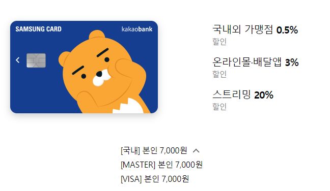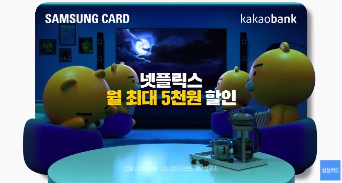 카카오뱅크 삼성카드 역시 전월실적 관계없이 모든 가맹점 0.5% 기본 할인 제공됩니다. 대형마트와 편의점은 조건 관계없이 1%할인이 적용됩니다. 여기에 전월실적 50만원을 채우면 넷플릭스를 비롯한 웨이브, 멜론, 영화, 커피, 교통, 쇼핑, 배달앱등에서 추가 할인을 받을 수 있습니다. 넷플릭스와 같은 OTT 서비스를 자주 이용하시분들 또는 1인 가구인 분들에게 아주 적절한 카드라고 할 수 있습니다.